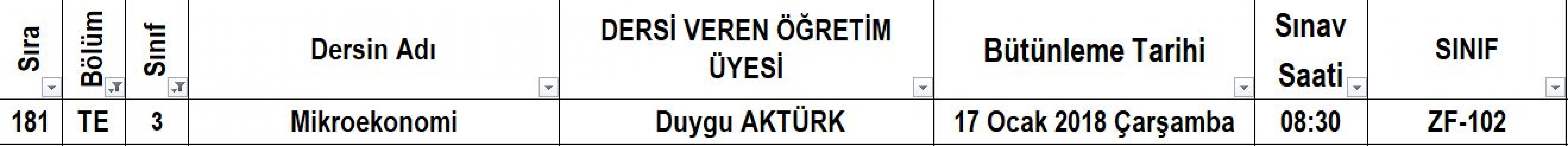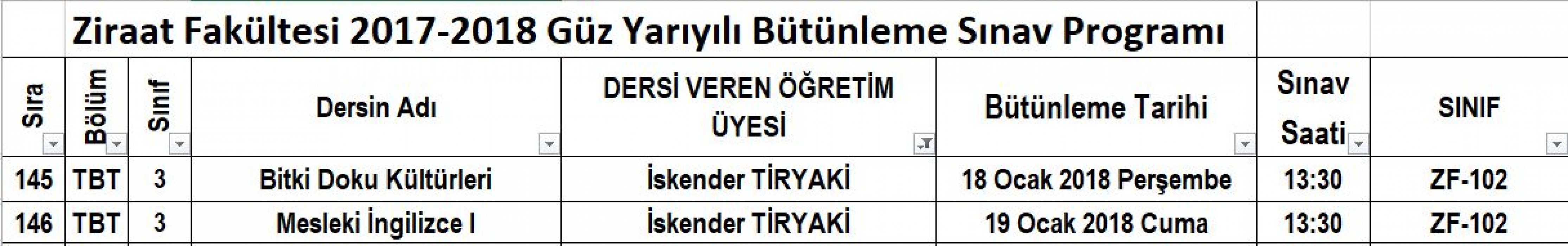 Ziraat Fakültesi 20017-2018 Güz Dönemi Bütünleme Sınav Programı