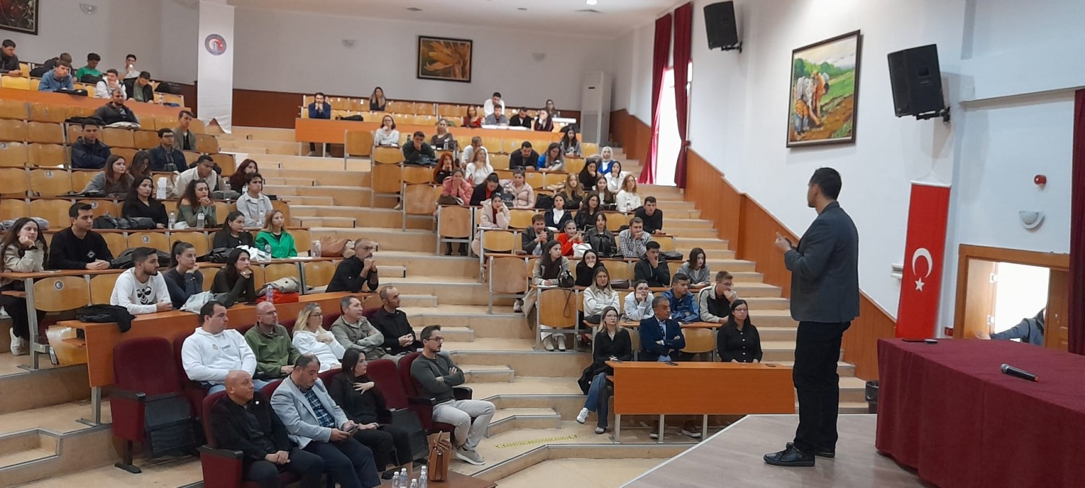 Ziraat Fakültesi Kariyer Planlama dersleri kapsamında 17 Kasım 2023 tarihinde Ziraat Fakültesi amfisinde yapılan Kariyer Söyleşileri programının bu haftaki konuğu Tarım ve Orman Bakanlığı İyi Tarım Uygulamaları ve Organik Tarım Daire Başaknı Dr. Başak Egesel oldu. Çanakkale Tarım ve Orman İl Müdürü Nazan Türkarslan, Ziraat Fakültesi Dekan Yardımcıları Prof. Dr. Fatih Kahrıman ve Doç. Dr. Burak Polat'ın katıldığı söyleşiye öğretim elemanları ve öğrencilerimiz de yoğun bir katılım gösterdiler. Dr. Başak Egesel konuşmasında öğrencilerimizin mesleki kariyerlerinde onları bekleyen zorluklar ve yapmaları gerekenlerle ilgili bir söyleşi gerçekleştirdi. Söyleşi sonunda Ziraat Fakültesi Dekan Yardımcısı Prof. Dr. Fatih Kahrıman ve İl Müdürü Nazan Türkarslan Dr. Başak Egesel'e plaket ve teşekkür belgesini takdim etti.
